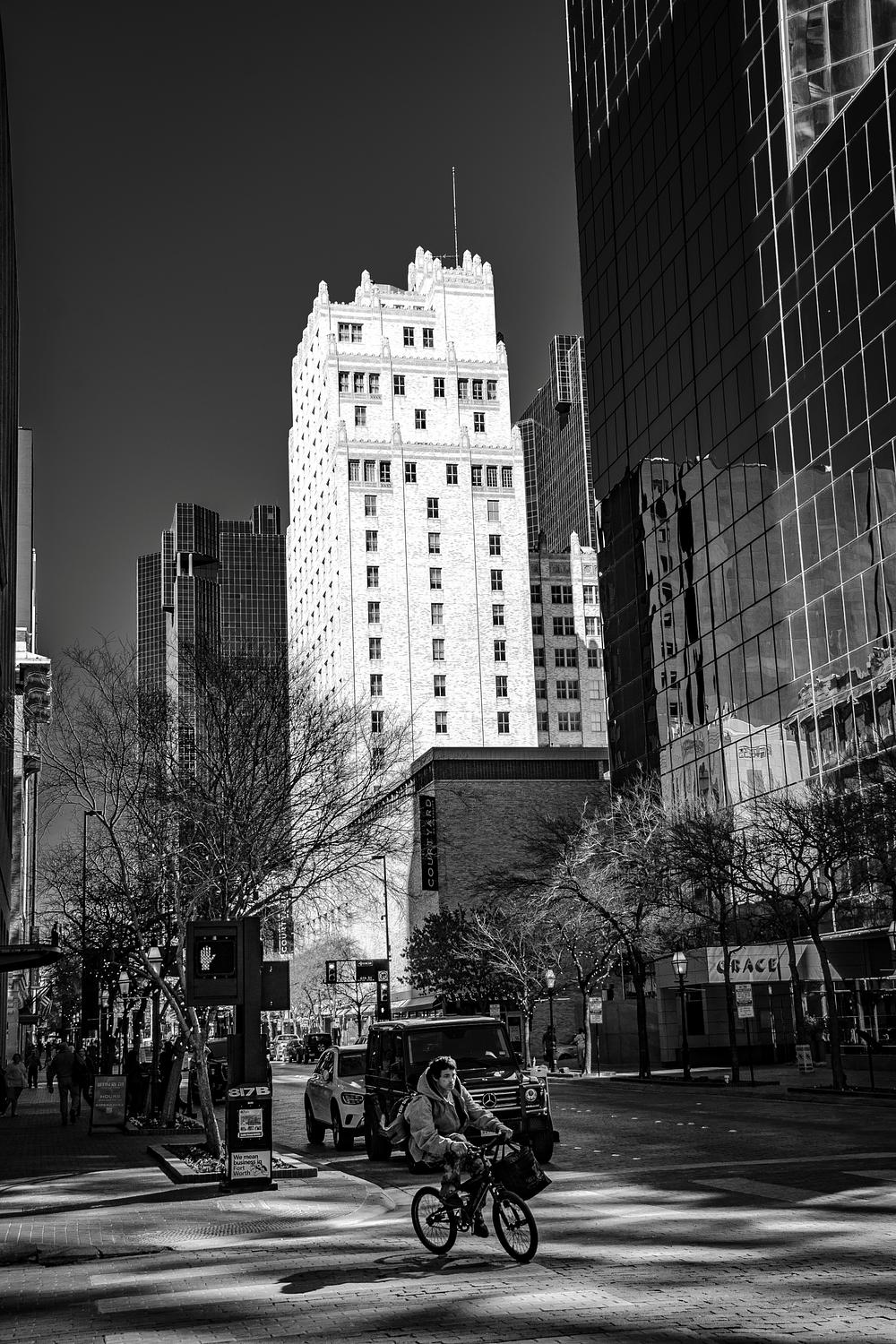 A cyclist cuts across the hush, threading through shadows taller than memory. Amid towering glass and stone, movement becomes defiance. A pulse where the city exhales.