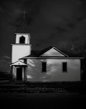White clapboard church at dusk, windows dark, dramatic sky. The last light of day slips away, leaving the structure in contrast—its door ajar, its silhouette sharp. Faith doesn’t always gleam; sometimes, it broods.