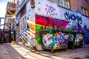From the Urban Echoes Collection: Vibrant street art emerges from shadowed alleyways, where layers of graffiti tell stories of urban expression. The dramatic interplay of bold colors against weathered walls captures the raw energy of street culture, while natural light creates dynamic shadows that frame the artistic intervention.