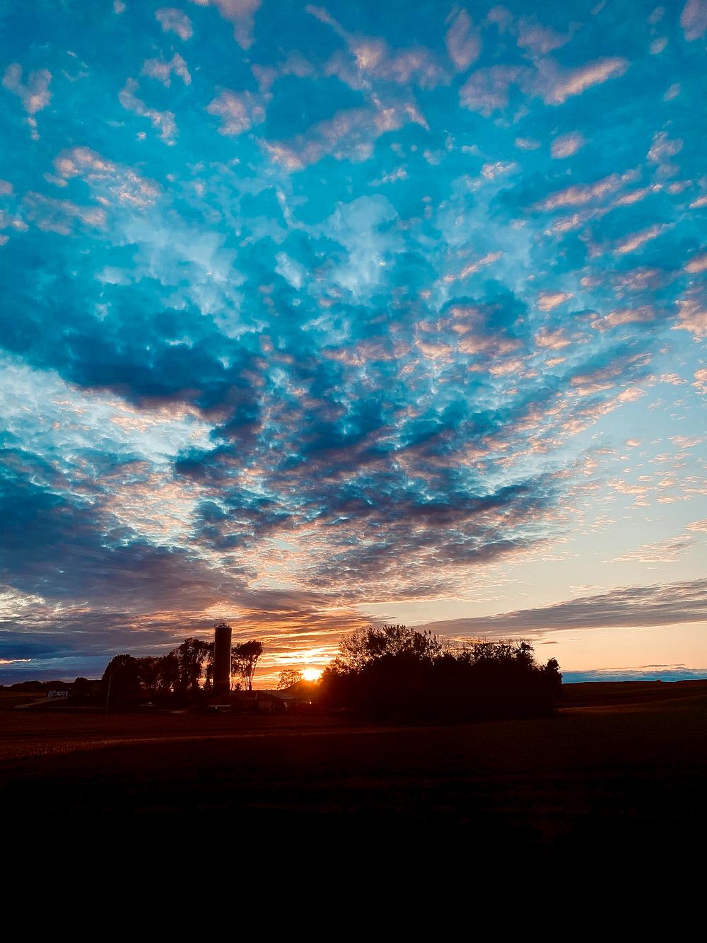 A lone silo stands watch against an explosive sky, where clouds scatter like embers across azure depths. The pastoral scene captures the dramatic interplay between human presence and natural grandeur, framed by the day's final light.