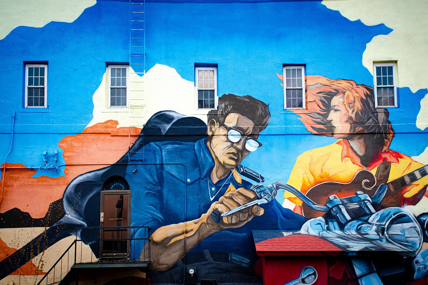 A collision of motion and music, this mural channels the grit of American rebellion and the fire of creative drive. The mirrored sunglasses and strumming hands suggest two paths—one racing forward, the other rooted in rhythm—both echoing with defiant energy.