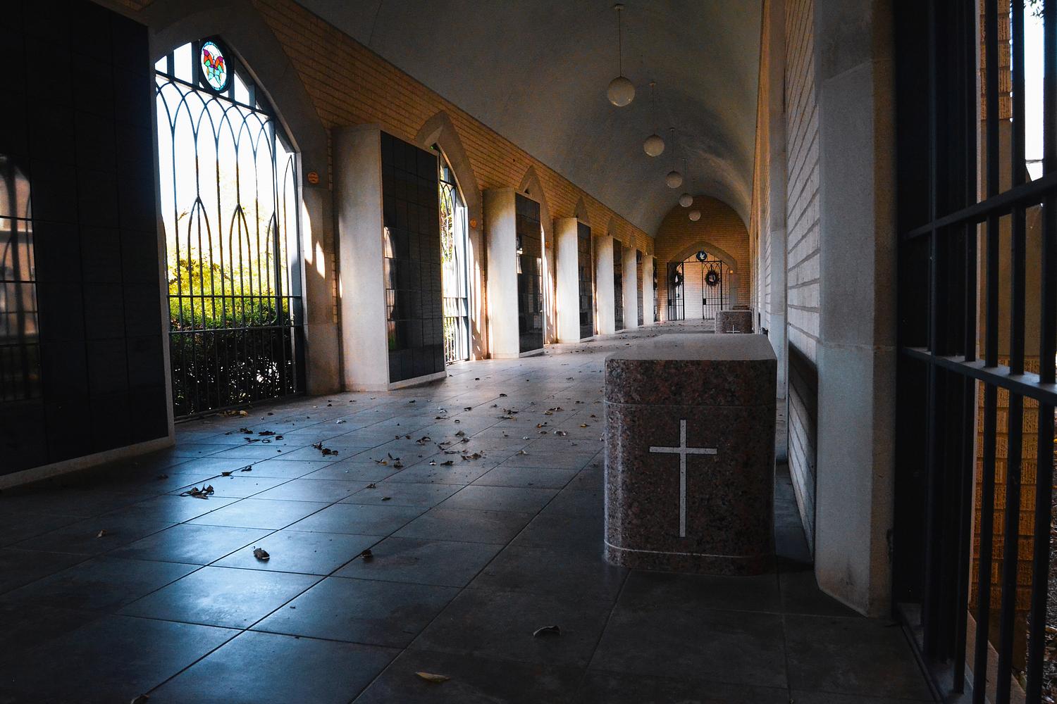 This corridor speaks in shadow and symmetry. A columbarium lined with absence, where the air feels thicker and the silence, sacred.